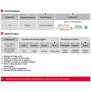 Téléchargez ci dessous la fiche technique complète (onglet fichier joint) afin de prendre connaissance du mode d'emploi (paramètres de découpe & d'application) et des instructions d'entretien et de lavage.