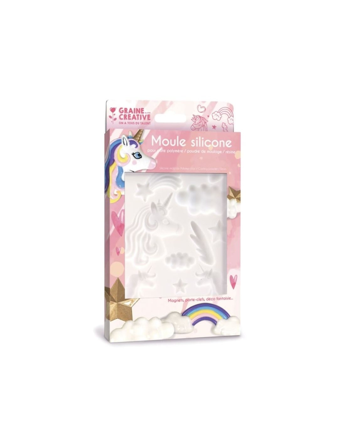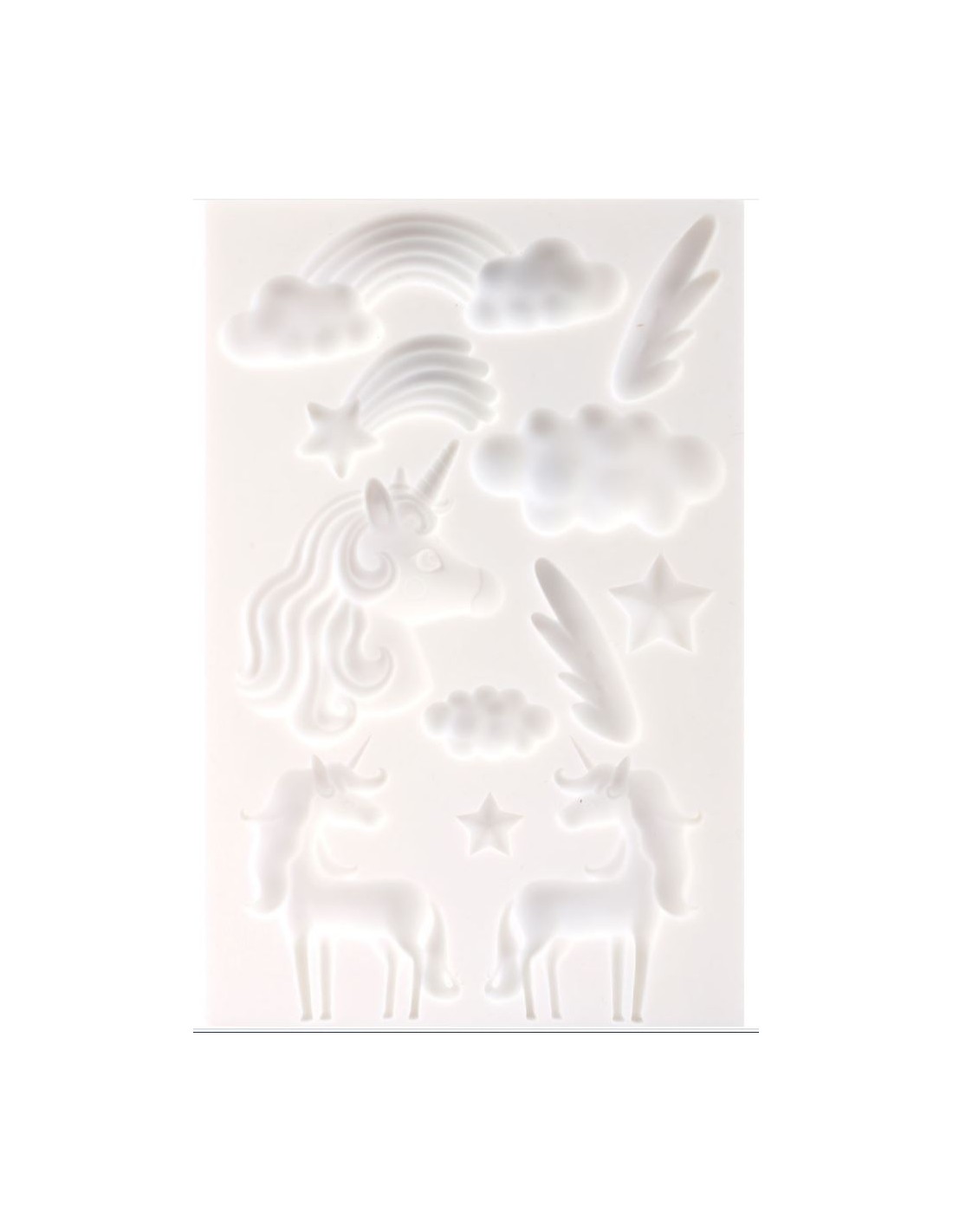 Ce moule en silicone de 20x13 cm représente une licorne. Il est idéal pour les loisirs créatifs. Les motifs sont très précis, ce qui permet une décoration réaliste. Les modèles ont été dessinés en France et sont adaptés aux enfants et aux adolescents. Le moule est très flexible, ce qui facilite le démoulage. Il peut être utilisé pour réaliser des miniatures en pâte polymère, qui peuvent être cuites au four à 110°C. Il est également très facile à nettoyer avec de l'eau savonneuse. Le matériau utilisé est du silicone. Avec ce moule, vous pourrez créer différentes formes liées à l'univers des licornes : licornes, étoiles filantes, arc-en-ciel, nuages, étoiles, ailes blanches. Vous pouvez également utiliser ce moule avec de la poudre de modelage ou de la résine pour créer d'autres formes. Vous pourrez réaliser des portes-clés, des magnets, des petits objets décoratifs, des bijoux, selon votre imagination. Les dimensions du moule sont de 20x13 cm.